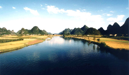 在山水甲天下的阳朔,有这样一条可以与漓江相媲美的河流,它就是素有“小漓江”之称的遇龙河。遇龙河河源自阳朔近邻之临桂县的古里河,它流经阳朔县的金宝乡、葡萄镇、白沙镇、新阳朔镇和高田乡,最后与金宝河相交汇于青厄渡,并一同流入下游的田家河。美国哈佛大学著名景观专家卡尔博士在徒步考察完遇龙河风景之后曾这样感叹道:“这是我在中国看到的最美丽的地方”。