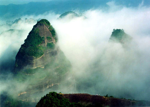 广西资源的八角寨又名云台山,主峰海拔814米,因主峰有八个翘角而得名,其山势雄浑博大,气势非凡。丹霞地貌发育丰富程度及品位高雅,被有关专家誉为“丹霞之魂”。“群螺观云”等130多处绝景完全出自于大自然的鬼斧神工,或惊险万状、或栩栩如生。山顶有一个 3000多平方米的平台,有宋元时代始建的天心寺。登高鸟瞰,经常可见云海、云带、云湖等奇景,凡登临绝顶者,莫不击掌称绝,叹为观止。